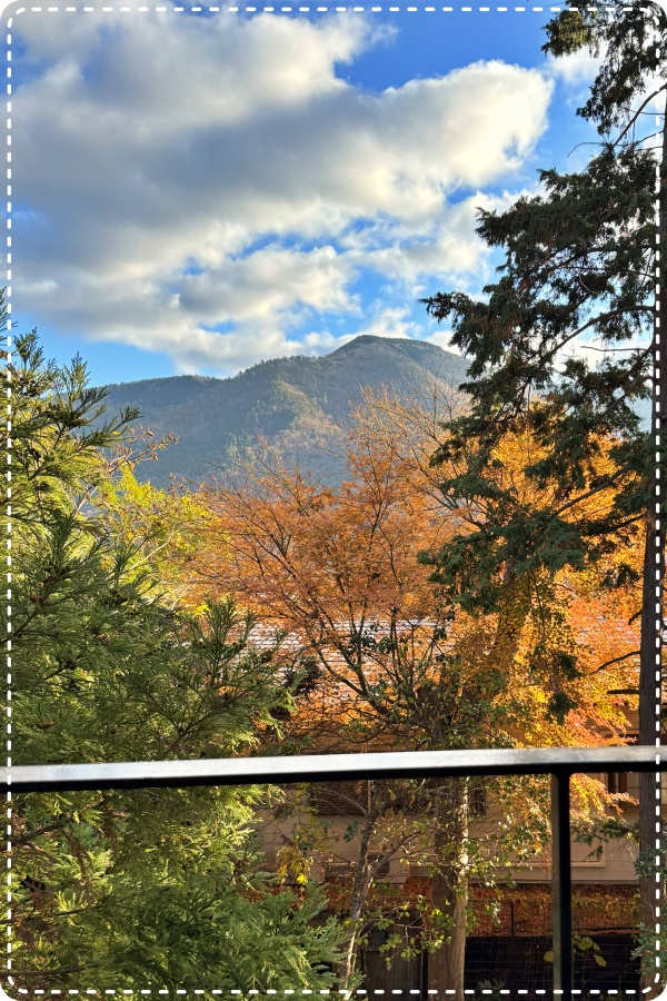 ベランダから 眩しいくらいの 朝日と 紅葉の木々に映える明星ヶ岳(みょうじょうがたけ)が 綺麗に見えます。