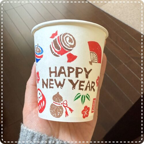 並んで漸く参拝した後、こんな可愛い コップで 振る舞い酒もいただきました。